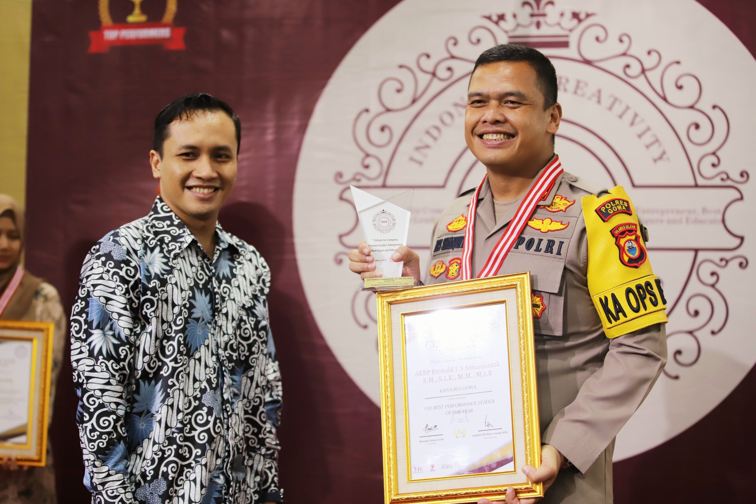 Kabarexpres | Gowa–Kapolres Gowa, AKBP R.T.S Simanjuntak, S.H., S.I.K., M.M., M.I.K., kembali menunjukkan prestasi gemilang dengan meraih penghargaan dari perusahaan “Sembilan Bersama Media” untuk kategori “THE BEST PERFORMANCE LEADER OF THE YEAR”. Sabtu (27/07/2024).