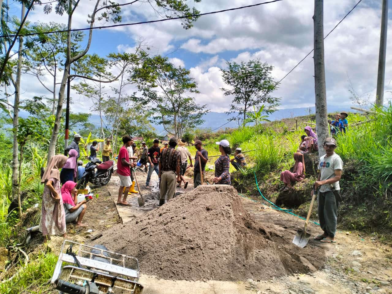 Jalan yang dulunya terlihat biasa biasa saja tanpa lapisan semen selaku penguat permukaan jalan,”kini warga desa mengerjakan dengan cara mengecor bersama warga Desa agar nantinya dapat bertahan lama serta mampu dilalui oleh kendaraan roda empat dan roda dua.