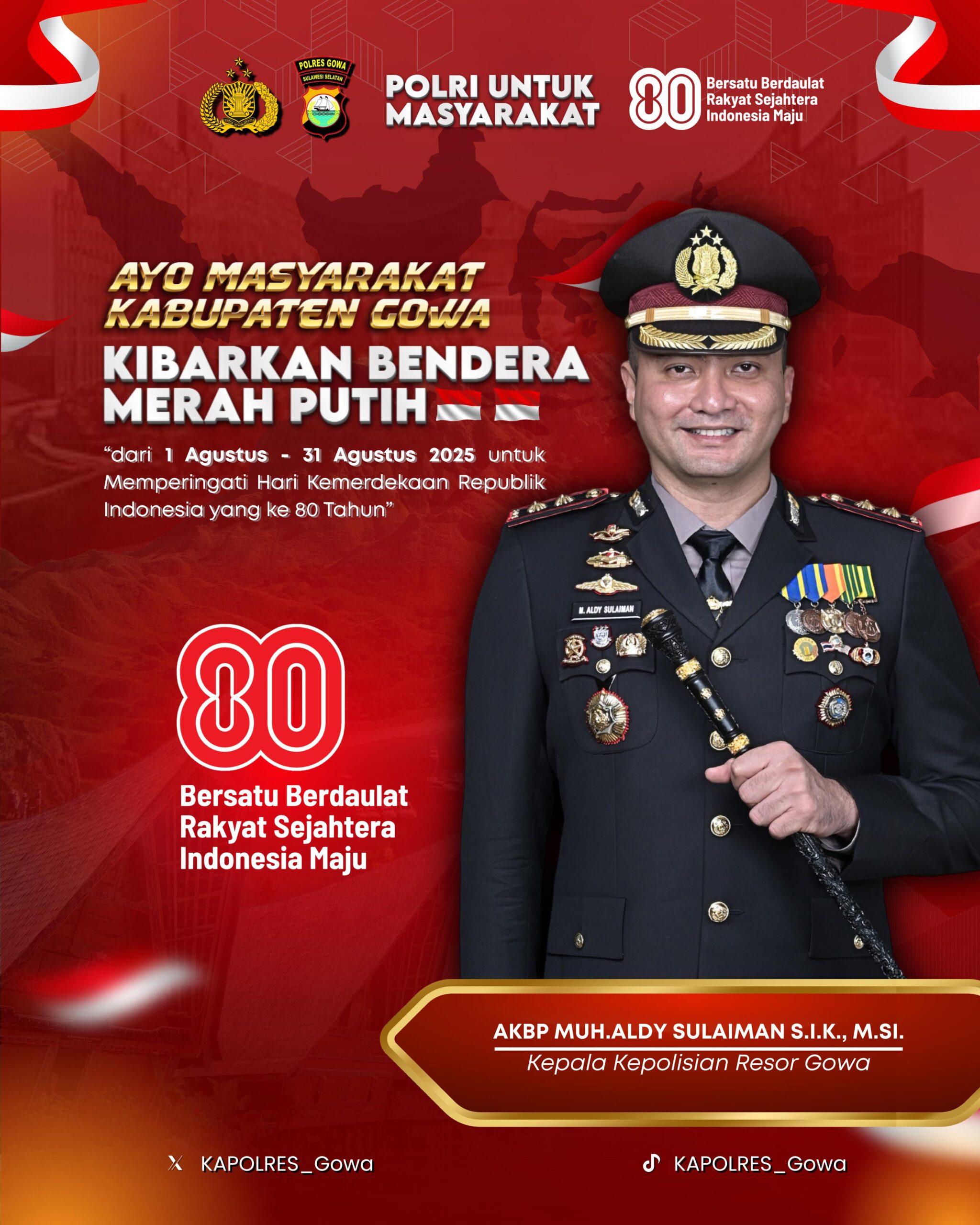 “Mari kita semarakkan peringatan HUT ke-80 Kemerdekaan Republik Indonesia dengan mengibarkan Bendera Merah Putih di rumah, kantor, sekolah, dan tempat usaha masing-masing. Ini adalah bentuk kecintaan kita terhadap bangsa dan negara,” ujar Kapolres Gowa.